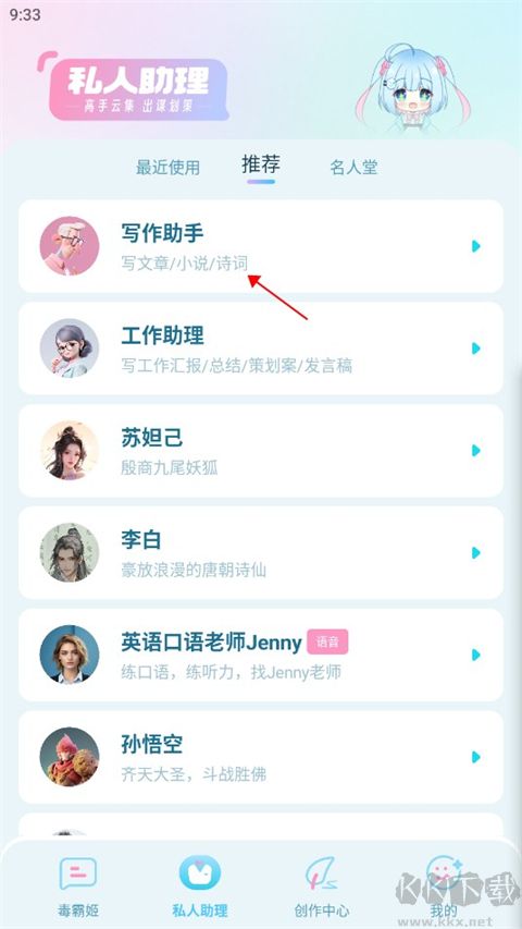 2、進(jìn)入私人助理界面,點(diǎn)擊 “寫作助手” 功能,輸入主題或關(guān)鍵詞啟動(dòng)文學(xué)創(chuàng)作輔助。