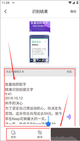 5、在結(jié)果頁面可對(duì)照原圖編輯文本,支持一鍵復(fù)制、翻譯、分享或保存文本至本地。
