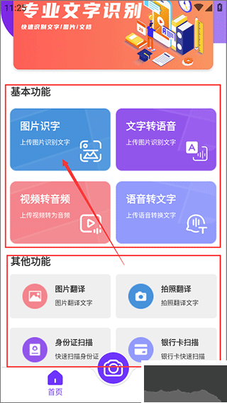 1、打開應(yīng)用,界面顯示圖片識(shí)字、文字轉(zhuǎn)語音、拍照翻譯等功能,按需選擇點(diǎn)擊進(jìn)入。