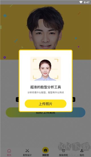 1、打開 后點(diǎn)擊 “測(cè)臉型” 選項(xiàng),拍攝清晰正臉自拍照或從相冊(cè)導(dǎo)入。