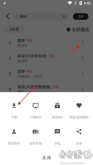3、搜索完成后,點(diǎn)擊歌曲右側(cè)菜單選項(xiàng),可進(jìn)行下載、播放、添加喜歡等操作。