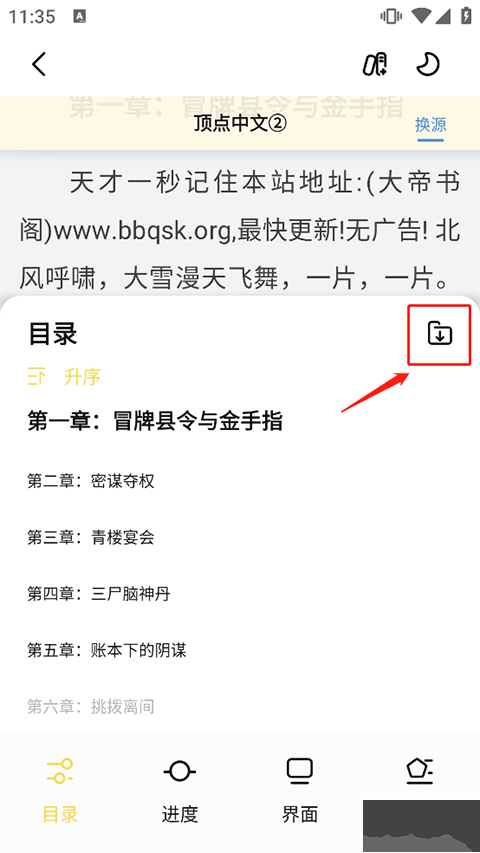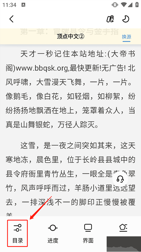 1、在小說閱讀界面中,點(diǎn)擊屏幕喚醒菜單,然后點(diǎn)擊右下角目錄功能