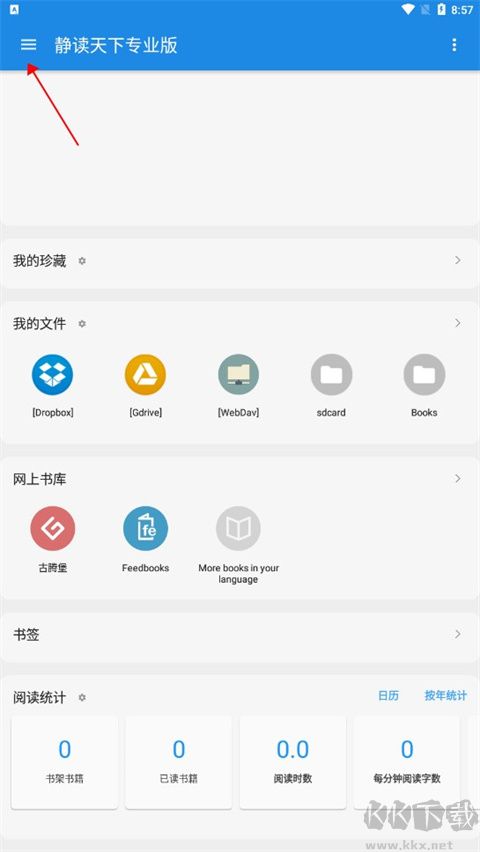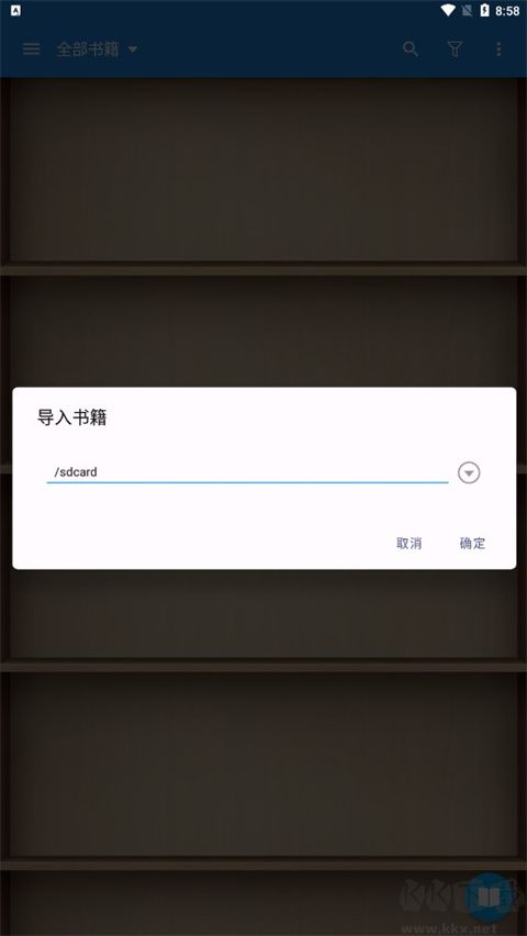 3、在書架主界面上,點擊右上角的一排豎點,然后在彈出的菜單中選擇“導(dǎo)入書籍”