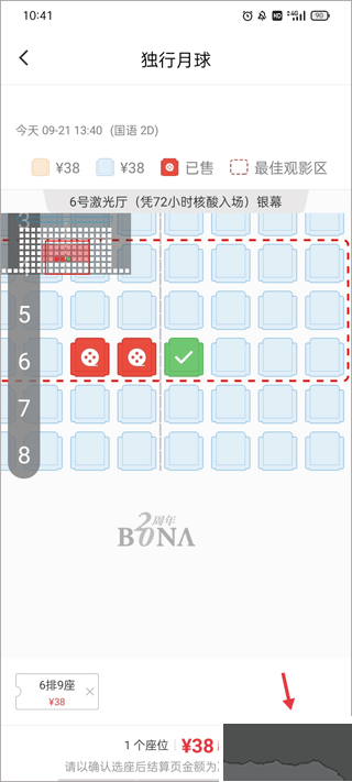 3、紅色表示已經(jīng)出售,淡藍(lán)色表示還未出售,選好觀影的位置,點(diǎn)擊下方的“確認(rèn)選座”按鈕。