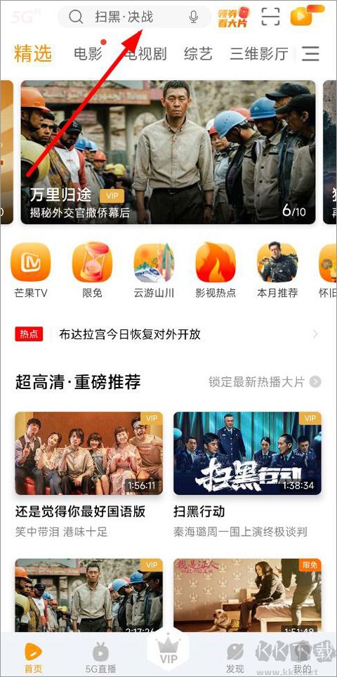 1、打開沃視頻app,登錄進(jìn)入首頁(yè),首頁(yè)有精選電影電視劇、超清推薦、熱播電視劇等欄目,在上方搜索框輸入要投屏的視頻