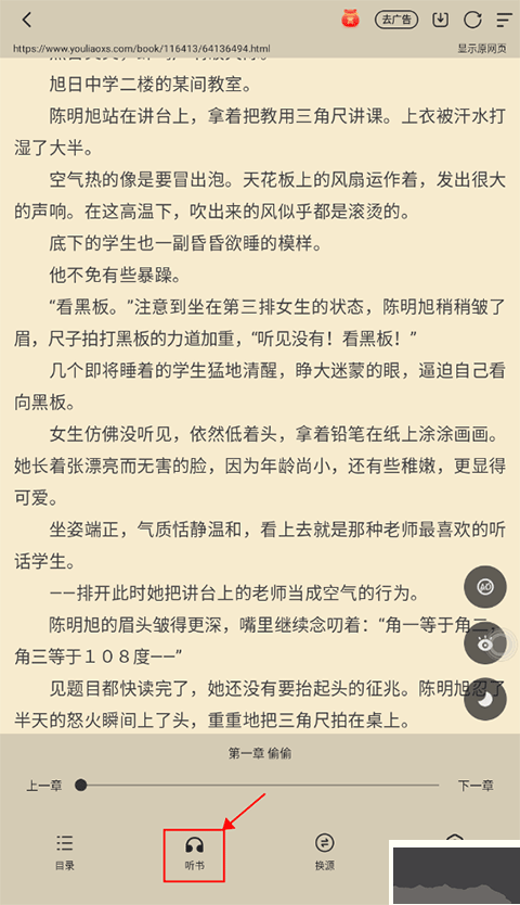 1、在小說閱讀界面點擊屏幕在底部會顯示“聽書”圖標(biāo)。