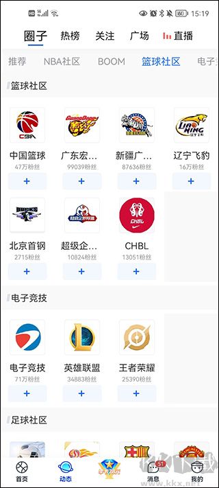 2、在動(dòng)態(tài)中點(diǎn)擊圈子可以看到一些關(guān)于nba中的熱門話題,同時(shí)還提供了許多社區(qū),例如籃球社區(qū)、電子競(jìng)技、足球社區(qū)等等。