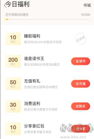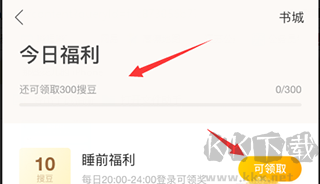 4、可以看到,每天通過完成任務,*多可獲取300搜豆,在20點至24點之間進行登陸可以完成“睡前福利“任務獲取10搜豆