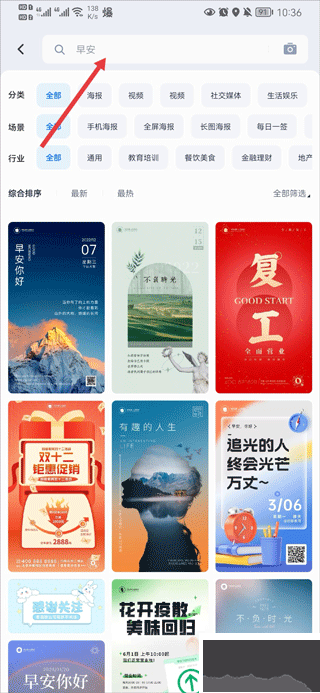 第一步:打開創(chuàng)客貼app,首先在首頁中點擊模板中心,并在搜索欄中搜索自己想要關鍵詞就會出現(xiàn)相關的模板,有免費的和付費的