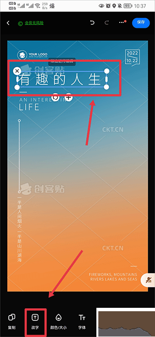 第三步:【修改文字】當你想修改文字或添加一些文字時,可以直接點擊需要修改的文字進行修改,也可以點擊下方菜單欄中的換文字,同時也可以對文字調整字體、樣式、顏色、排版等,使得做出來的海報更加美觀