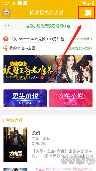1、打開閱讀星后,點擊右上角的「書架」按鈕,進入你的個人書庫。