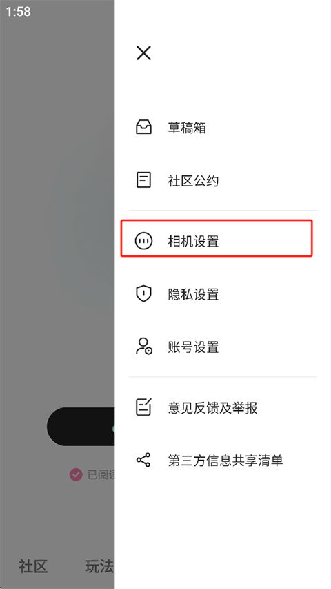 2、點擊右上角的“三橫線”菜單按鈕,選擇“相機設(shè)置”選項,進入設(shè)置頁面。