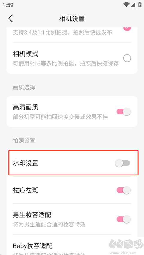 3、找到“水印設(shè)置”開關(guān),關(guān)閉即可(部分版本顯示為滑動按鈕)。