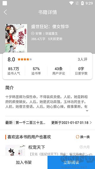 4、開始閱讀:找到后可以加入書架、下載緩存,還能分享給朋友,或者直接在線閱讀