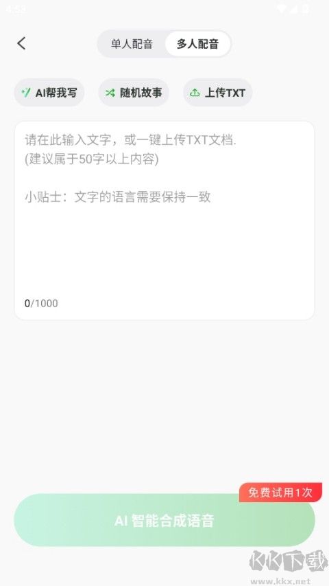 2、AI文字轉(zhuǎn)語(yǔ)音支持多語(yǔ)言同步翻譯朗讀,包含“AI幫我寫”、“隨機(jī)故事”和“上傳TXT文件”三種創(chuàng)意模式