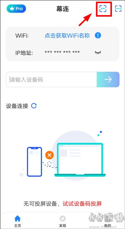 2、手機(jī)端點(diǎn)擊右上角圖標(biāo),在最下方可看到【我的投屏碼 】