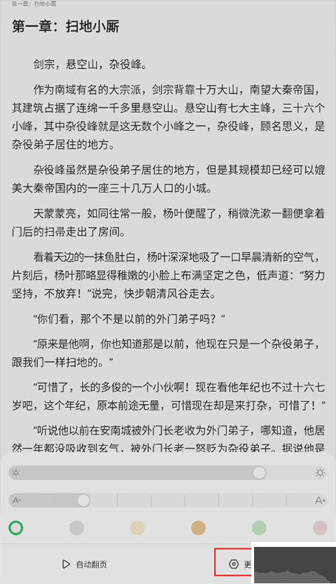 1、同樣是在小說(shuō)閱讀界面先點(diǎn)擊屏幕可以看到底部有一個(gè)“設(shè)置”-“更多設(shè)置”