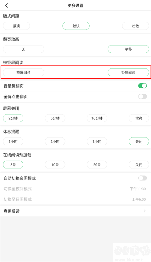 2、進(jìn)入更多設(shè)置頁(yè)面,在橫豎屏閱讀一欄選擇“橫屏閱讀”就可以啦。