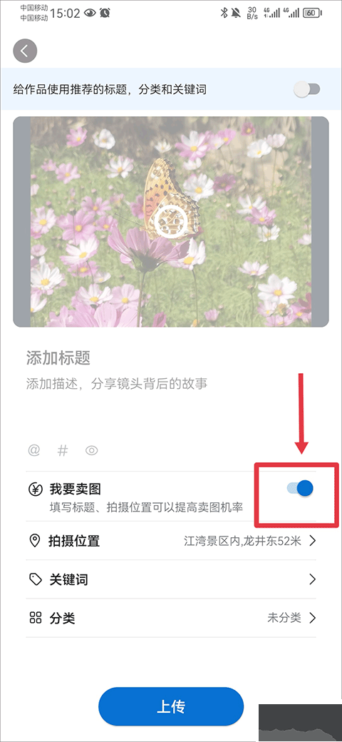 4、填寫(xiě)作品標(biāo)題、描述、分類(lèi)等信息,開(kāi)啟"我要賣(mài)圖"選項(xiàng),提交后等待買(mǎi)家選購(gòu)即可。