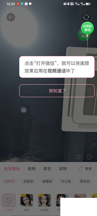 3、點(diǎn)擊應(yīng)用到微信,就能打開微信,將美顏效果應(yīng)用在視頻童話中了。