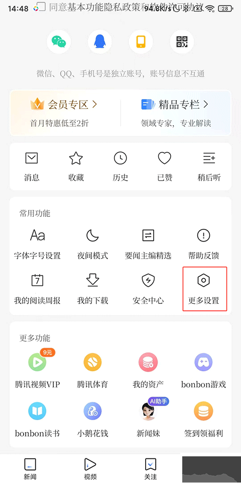 1、打開騰訊新聞App,點擊“我的”->“設(shè)置”;