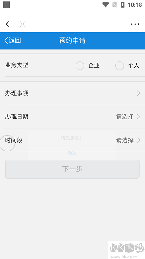 4、接著在預(yù)約申請(qǐng)當(dāng)中填好業(yè)務(wù)類型、辦理事項(xiàng)、時(shí)間段后點(diǎn)擊下一步;
