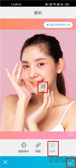 4、選好修補(bǔ)范圍后,按一下【掃除】按鈕,最后記得點(diǎn)擊右下角的【打勾】確認(rèn),修改就保存好啦。