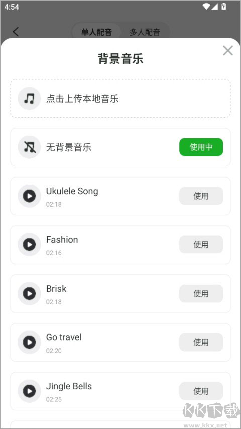 5、可添加伴奏音樂(lè),選擇網(wǎng)絡(luò)曲庫(kù)或本地音頻文件。