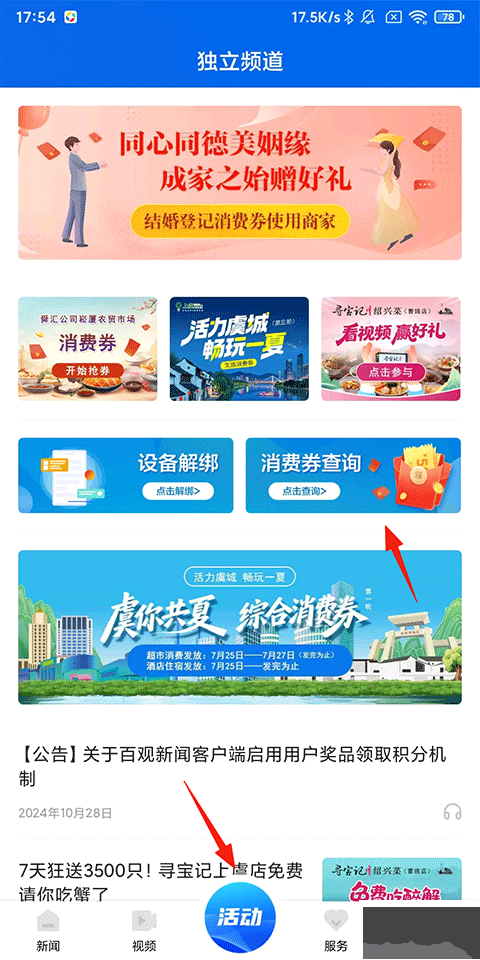 1、打開百觀新聞APP,點擊活動-消費券查詢?nèi)肟冢?/p>