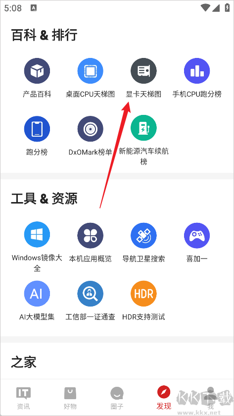 1、在“發(fā)現(xiàn)”頁(yè)中,設(shè)有“百科排行”、“工具資源”和“之家”三大板塊。進(jìn)入“百科排行”,選擇“顯卡天梯圖”