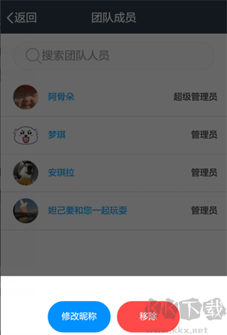 通過團(tuán)隊(duì)成員管理,可進(jìn)行管理員設(shè)置、成員移除、團(tuán)隊(duì)昵稱修改等操作。