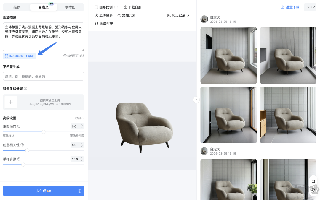 該功能接入Deepseek R1模型,支持自定義模式自動(dòng)生成提示詞,