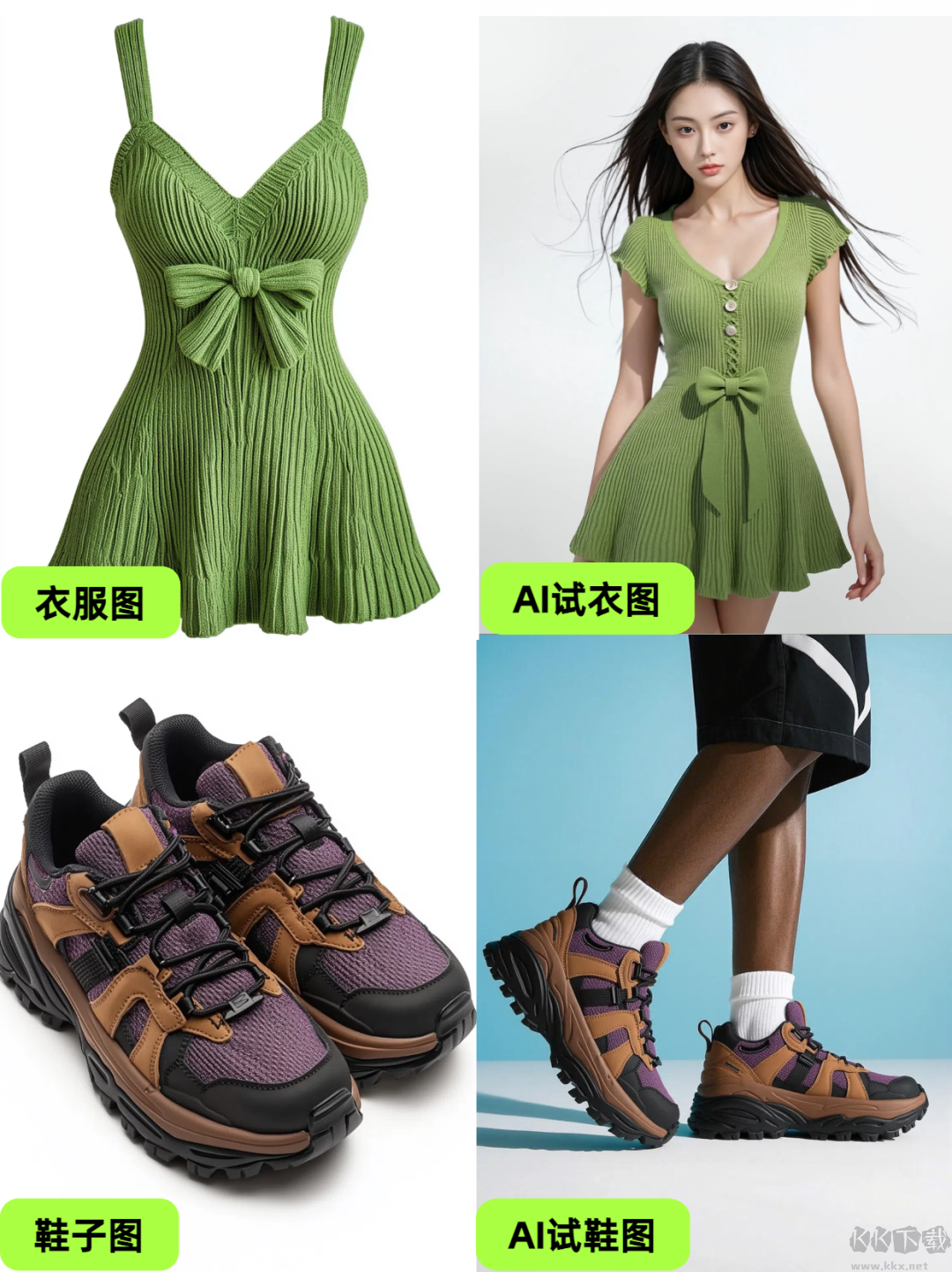 同時(shí)可生成服裝/鞋類(lèi)試穿效果圖,上傳產(chǎn)品圖并選擇姿勢(shì)即可直接輸出。還提供服裝換色、去皺等便捷功能。