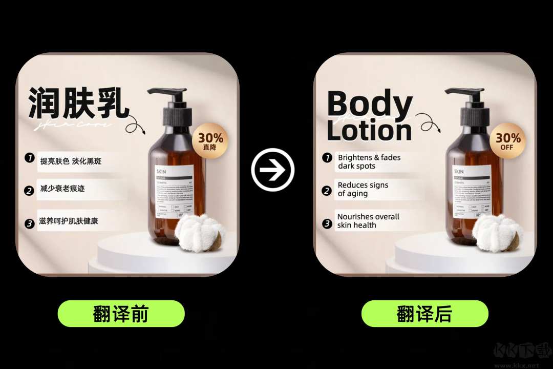 支持將圖片中的文字一鍵翻譯為英語(yǔ)、韓語(yǔ)、德語(yǔ)等20余種語(yǔ)言,適應(yīng)跨境電商的多語(yǔ)言運(yùn)營(yíng)需求。用戶可靈活調(diào)整排版、修改字體與顏色。