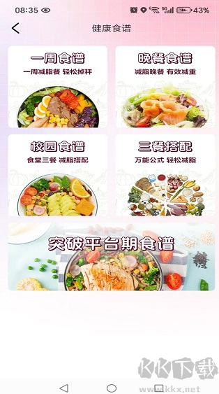 3、點(diǎn)擊查看健康食譜,獲取一周食譜、三餐搭配等多種飲食方案;