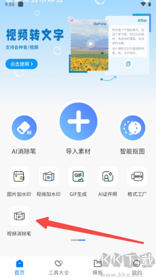 1、點(diǎn)擊進(jìn)入水印云App,找到視頻消除筆;