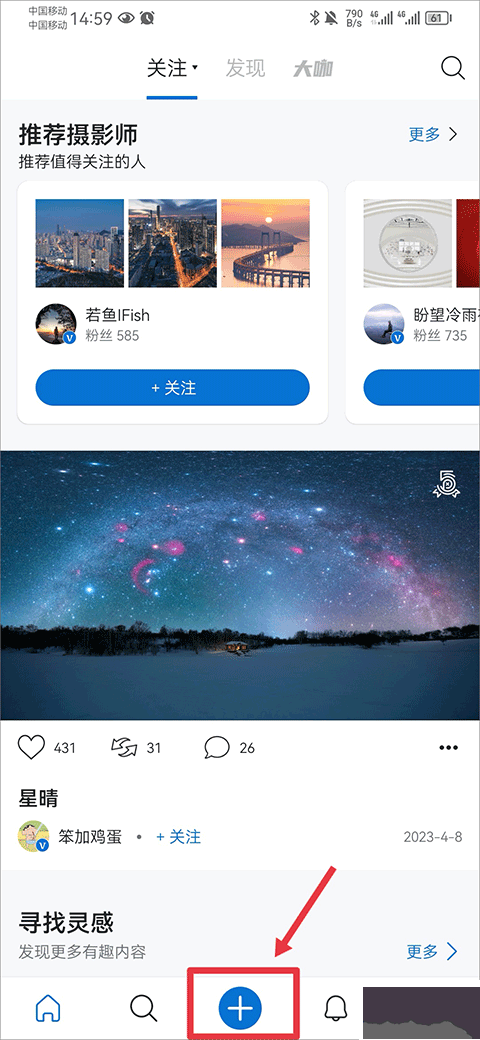1、在視覺(jué)中國(guó) app 中點(diǎn)擊下方菜單欄中的藍(lán)色 + 號(hào)。