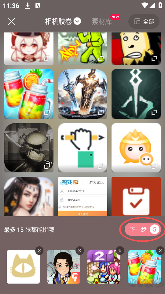 2、從相冊中挑選需要拼接的照片,點擊下一步