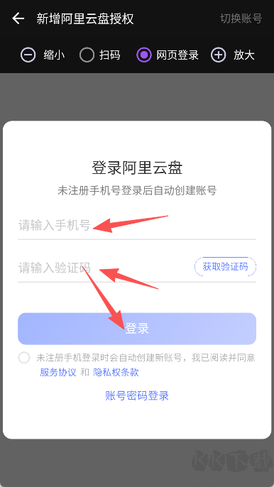 3、如選擇阿里云盤,可通過手機(jī)號(hào)登錄賬戶