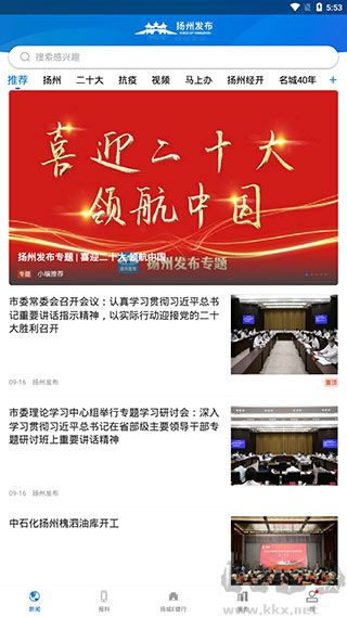 1、進(jìn)入揚(yáng)州發(fā)布app之后,我們就能在新聞頁(yè)看到一些綜合性的【新聞資訊】,但這并不是我們想瀏覽的最新通告。