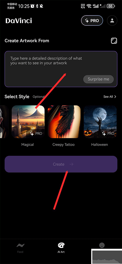 3、點(diǎn)擊后會(huì)跳轉(zhuǎn)到 AI Art 界面,接著在上方文本框里輸入您希望在您的藝術(shù)作品中看到的詳細(xì)描述,之后點(diǎn)擊 create。