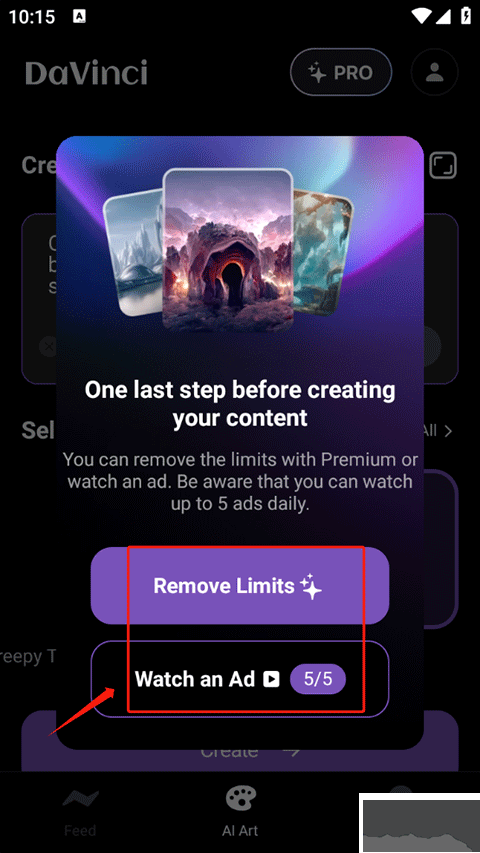 4、如果您充值了會(huì)員,就點(diǎn)擊 Remove Limits 生成,要是沒(méi)有充值,就點(diǎn)擊下面的觀看廣告來(lái)獲取生成機(jī)會(huì)。