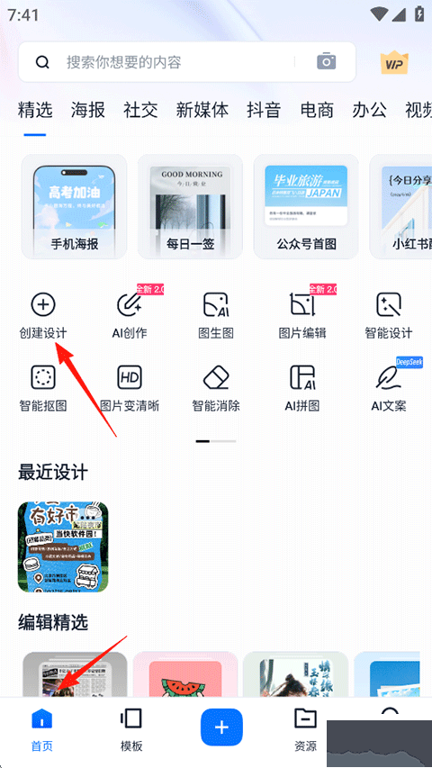 1、打開(kāi)App,點(diǎn)擊首頁(yè)“創(chuàng)建設(shè)計(jì)”功能;