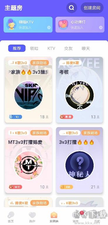 提供多種主題的多人語(yǔ)音房,支持排麥演唱、記歌詞游戲、交友互動(dòng)及小游戲PK等豐富玩法,趣味性更強(qiáng)。