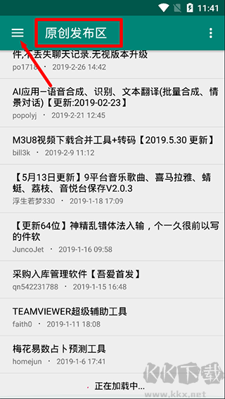 1、獲取吾愛破解程序后,首先完成安裝并啟動(dòng)應(yīng)用,主界面會(huì)顯示原創(chuàng)發(fā)布區(qū)的內(nèi)容,如需查看其他分區(qū),可點(diǎn)擊界面左上角的三橫圖標(biāo)進(jìn)行切換。