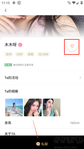 3、隨后可以點(diǎn)擊愛心等待對(duì)方發(fā)現(xiàn)你找你聊天,或者膽子大一點(diǎn)直接點(diǎn)擊私聊