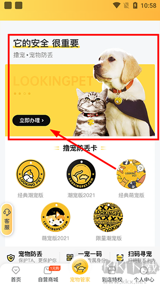 2、跳轉(zhuǎn)至寵物管理頁(yè)面,點(diǎn)擊【立即辦理】來領(lǐng)取防丟卡。