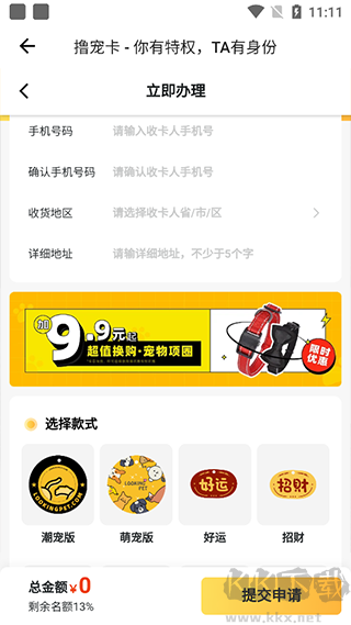 3、填寫個(gè)人信息,選擇款式,接著點(diǎn)擊【提交申請(qǐng)】,之后請(qǐng)耐心等待接收快遞。