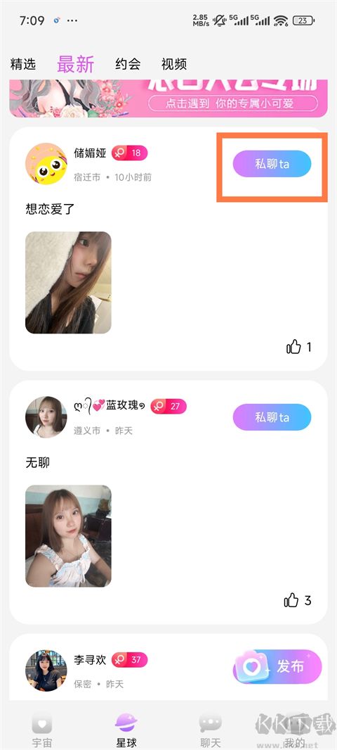 4、如果你不想打視頻,可以點擊星球板塊,這里也有很多漂亮小姐姐,點擊私聊ta