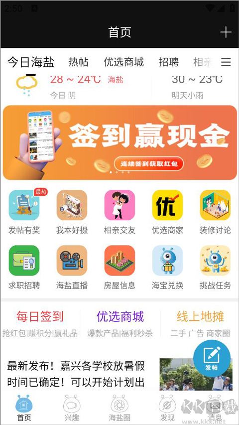 1、打開海鹽網(wǎng) app,登錄后進入主頁,在主頁能看到當(dāng)天天氣、熱門帖子、優(yōu)質(zhì)商城、最新發(fā)布的內(nèi)容等。